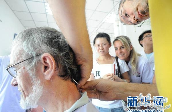几名中外学生在沈阳市中医院学习针灸(8月12日摄)