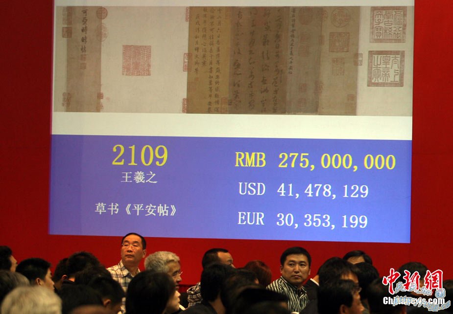 自黄庭坚的《砥柱铭》于6月初拍出4.368亿元人民币的天价之后,中国古代书画市场骤热。王羲之的《草书平安帖》自此次嘉德秋拍预展以来就广受关注,此番经过多轮竞价,最终飚至3亿零8百万元成交,全场震动。