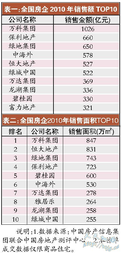 中国房产信息集团联合中国房地产测评中心共同发布的《2010年度中国房地产企业住宅销售排行榜》显示,全国近40家房地产开发商闯入百亿元行列,主要的30家房企累计销售金额接近8700亿元,房价同比上涨24%。其中,万科继续稳坐第一,恒大地产销售面积位居第二。