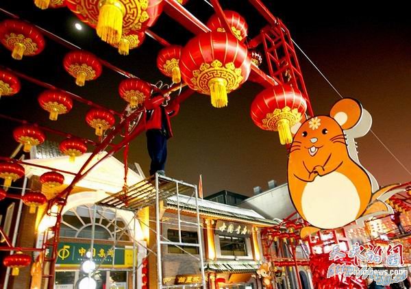 北京前门大街将在正月十五举办上元灯会,灯会活动将由点灯仪式、赏灯游艺、走街表演三项活动组成,游人可在此观赏五福添财、舞龙舞狮、皇帝观灯、戏曲演唱、魔术、杂技、吆喝叫卖等精彩表演。图为工作人员布置花灯。中新社记者 张宇 摄