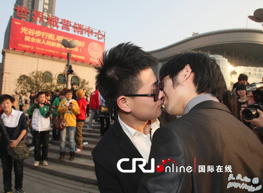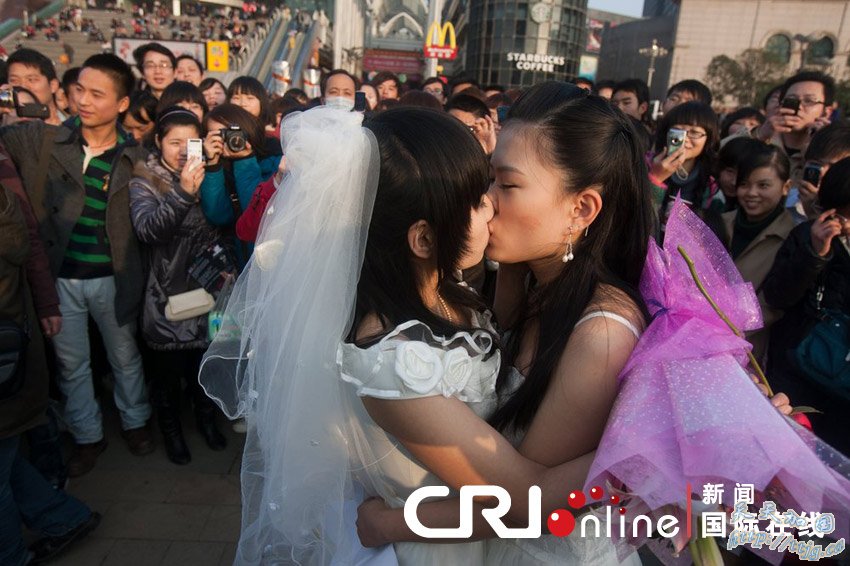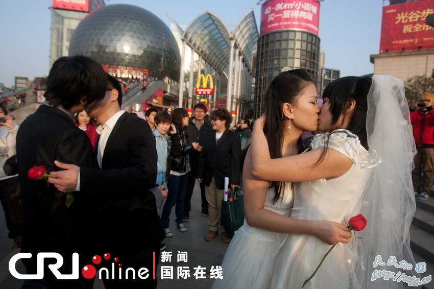 2011 年3月8日三八妇女节,湖北武汉光谷步行街,在四位单车环游世界的街头音乐家的婚礼进行曲伴奏下,两对身着婚纱礼服的青年男女,朗诵誓言,亲吻对方。这场特殊的“同性婚礼”其实是武汉的同志组织以“同性婚礼”为形式进行的一次行为艺术表演,希望借此形式,来表达性小众人群渴望得到社会大众的认同和理解。其中一名“新娘”在接受采访时表示:“选择三月八日妇女节在大众面前进行‘婚礼’,也旨在声援李银河在两会上提出的同性婚姻合法化提案。”