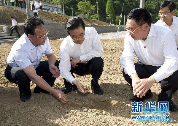 从鄂西北山城十堰到省会江城武汉,胡锦涛深入基层调查研究。他走进一片旱情严重的农田,翻开田里的土壤查看墒情,并向村民了解旱情。得知村里现在正把插不上秧的水田改成旱地,抢种玉米、花生、大豆等抗旱作物。总书记拿起锄头和村民一起补种玉米。
