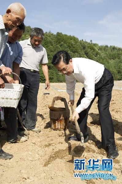 胡锦涛在视察受旱农田时,拿着锄头和村民一起补种玉米。新华社记者黄敬文摄