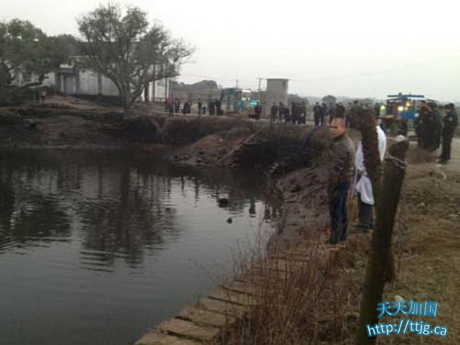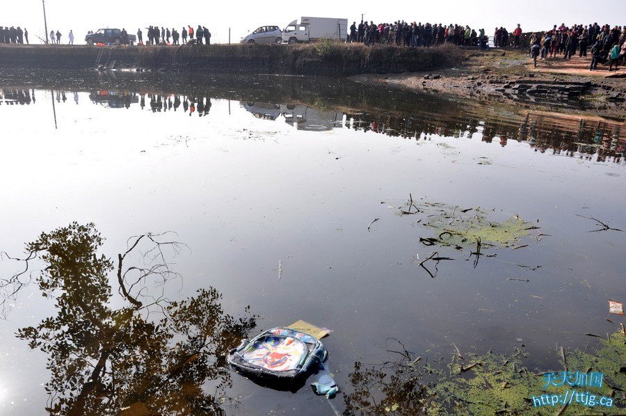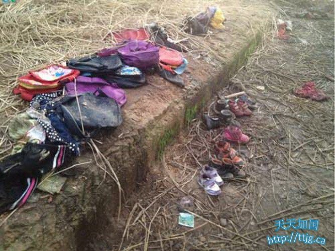 12月24日,面包车侧翻坠入的水塘水面漂浮着孩子的书包。新华社发