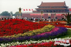 为迎接中国人民共和国建国61周年,今年天安门广场国庆花卉布置启用新设计,主题为花开盛世。广场中心呈现巨型牡丹,由数十万盆各色花卉共同组成。中新社记者 富...