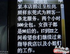 网友收到东莞一色情场所发来的揽客短信 华声在线8月26日报道 由于全国扫黄风声正紧,本店搬迁至松岗,照样东莞式为顾客提供一条龙服务。、有强硬的后台的,不怕...