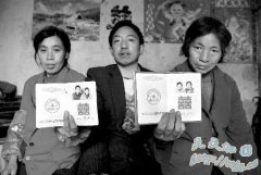 熊金珍(左)、蔡成容(右)各自拿着自己的结婚证坐在丈夫任昭树的身旁。 新华网5月23日报道 重庆市綦江县男子任昭树的老婆疑遭人拐卖失踪5年后,村里给他开了一份...