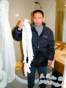 死者舅舅望建华提着杨元元自缢用的工具:毛巾和枕巾绑成的绳子。 记者 吴伟 摄 中国广播网12月12日报道 昨日下午2时半许,上海海事大学法学院,向自杀女硕士杨...