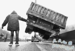 5日,一辆货车因道路结冰而失控冲下贵新高速公路。工作人员利用吊车施救 新一轮冻雨天气来袭。困扰交通部门的道路拥堵和车辆滞留现象能否缓解?冰情加重,电网...