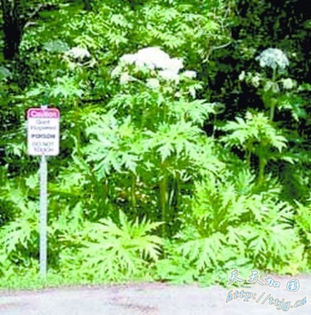 《明报》消息,近日在万锦市2处地方发现一种对人体有极大危害的毒草──大豕草(giant hogweed,下图),由于该草的毛须、枝干、树叶都含毒汁,如果人的皮肤接触到它,会导致光照性皮炎,使皮肤由红色变为起令人疼痛的小水泡;如果眼睛接触到它,则会导致暂时失明甚至永久性失明。万锦市府呼吁市民要小心,避免接触这样的毒草,如果不小心碰到,要立即用水清洗被感染部位,尽量避免太阳照射,并立即就医敷药;市民一旦发现毒草,要立即向市府报告。