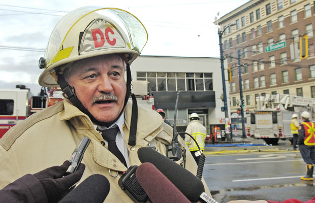 一场大火烧毁了温哥华Main街和Broadway十字路口附近的一些商业建筑,火苗窜入空中十米高,烧毁了电力设备,并造成几个街区交通堵塞。