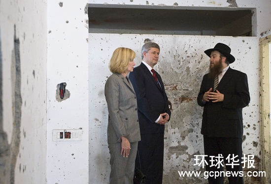11月16日,孟买,总理哈珀和夫人访问2008年11月26日遭恐怖袭击的东正教犹太文化标志——恰巴德楼。