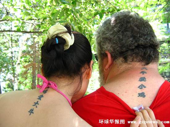 不一般的纹身说服了移民官 也许是Yin的豪放性格﹐还有敢作敢為的“辣妹子”脾气﹐她一直就对自己的婚姻都充满了信心。但朋友中却不乏泼冷水的﹐说Yin嫁了个穷老外﹐真的不划算。也有人讲﹐这个穷老外﹐如果回加拿大不能把Yin办过去﹐那Yin以后可怎麼办呢﹖Yin当时也知道﹐虽说她和Dave的感情很稳定﹐但是在那么短的时间办理夫妻团聚移民,的確是不容易。特別是Dave几乎没有任何积蓄﹐如果团聚移民被拒﹐他可能连上诉费都付不起﹐更不说一趟一趟往中国跑了。於是他们商量一定要让移民官相信他们俩是真心相爱﹐靠爱情的力量说服移民官。继而,Dave想出一个大胆的方案:叫爱情纹身。按中国的属相﹐Dave属牛﹐Yin 属鸡﹐他们俩就在上海的一个纹身作坊裡﹐David在背上纹上了﹕大牛爱小鸡。Yin也相应纹了一句话:小鸡爱大牛。Yin说﹐因為她人很瘦﹐纹身师说﹐她纹的地方又是全身最敏感的处﹐所以那一笔一划的刺痛,让Yin眼泪汪汪而破口大骂Dave。Yin说﹐当时自己能坚持纹完那几个字﹐真的是靠爱情的力量﹐纹身之痛让她终生难忘。然而就是他们独特的爱情纹身,让他们的爱情更加与眾不同﹐特別是夏季﹐俩人走在大街上﹐就等于告诉所有的人:“大牛”和“小鸡” 的爱情无懈可击。