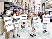 加拿大最令人瞩目的是温哥华的示威队伍﹐几名绿色和平成员不畏严寒﹐在车站脱去衣服举着标语牌抗议﹐身上只剩薄薄的内衣裤。一名示威者身上已冻起了鸡皮疙瘩﹐但她仍然坚称自己不怕冷。