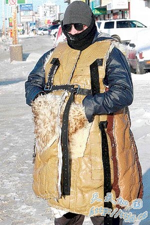 周日爱明顿创低温记录,街道上出现一名穿着自制冬季大衣的男子。他说大衣是利用3吋厚羊皮毡和皮革缝制而成的。