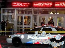 图:一名男子在电影院前门外被打死后,警方封锁了现场。