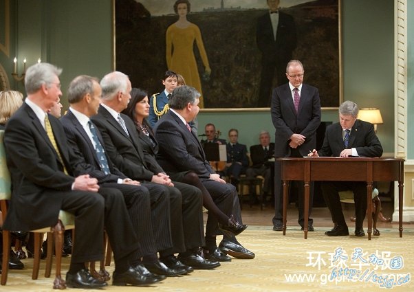 加拿大联邦政府今天改组,图为今天上午,在总督府举行的新部长宣誓仪式后,总理哈珀签署有关文件。