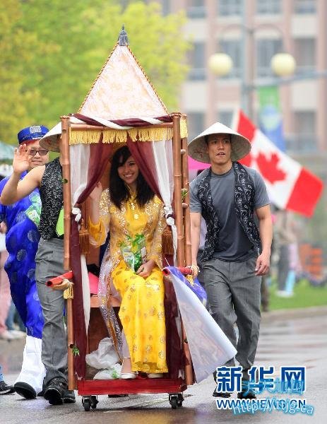 (责任编辑:小芬)万锦办首届国际花轿节 5月14日,在加拿大安大略省万锦市,一组活动参与者抬着装扮成输...
