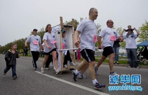 5月14日,在加拿大安大略省万锦市,一组活动参与者抬着装扮成输液室的轿子在长跑比赛中。当日,加拿大安大略省万锦市举办了首届国际花轿节,设有抬花轿长跑、花轿巡游和花轿装扮等活动,吸引了当地不同族裔的近40支队伍参加。