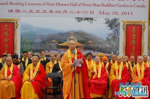 环球华网上官天乙综合报道:加国佛教史和多元文化建设正在谱写新的一页。2011年5月28日(昨日),位於加拿大安大略省彼得堡 (Peterborough)的加国五台山仿唐大雄宝殿﹐在冒雨站于泥泞中的逾2,000名(此据世界日报和明报报道。加国无忧报称1800人)佛教界长老、僧俗弟子、信众和各界名流的亲眼见证之下,举行了奠基大典。彼得堡约距多伦多100公里。据悉,加国五台山将建成兼具宗教、文化、艺术、教育、慈善以及旅游等多功能的文化园区。