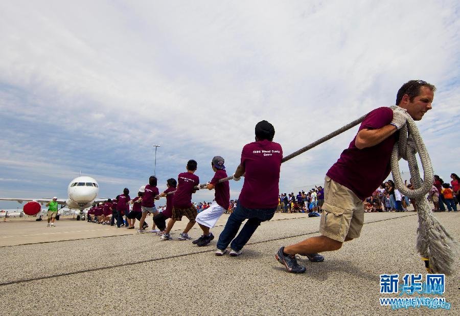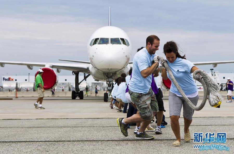 8 月20日,加拿大多伦多市举行“拉飞机比赛”,吸引了40支队伍参赛。比赛要求每支参赛队由25名选手组成,通过绳索拉动一架60吨重的货运飞机前进12 英尺(约合3.66米),耗时最短的队伍获胜。这项由“加拿大奥比斯眼疾治疗组织”主办的比赛,旨在为发展中国家眼疾儿童治疗募集资金。