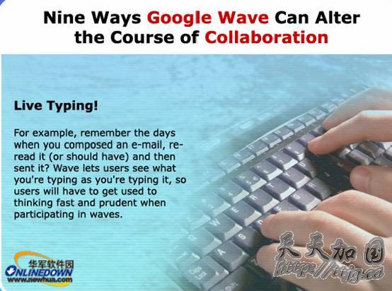 举例来说,传统方式中电子邮件需要经过“编写”—“检查”—“发送”三个步骤。但是在Google Wave中,即使信息没有被发送出去,对方随时可以看到你正在打字的内容。