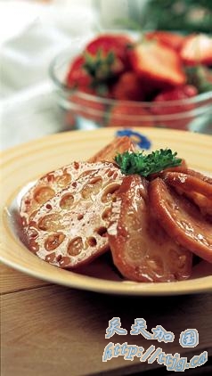 4.将糯米藕切成片,摆入碟中,浇上桂