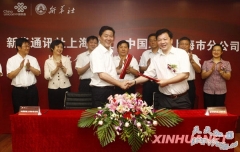 8月21日,上海联通总经理蔡全根(前左)与新华社上海分社社长慎海雄(前右)代表合作双方交换签约文本。 当日,新华社上海分社与中国联通上海分公司签署战略合作协议。上海联通将利用其先进的3G通信技术,实现新华社世博报道团的多媒体移动办公,助力新华社...