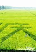两位农场职工在长出国庆祝福的稻田里除草(8月19日摄)。 近日,在位于鸡西市的黑龙江省八五六农场的一处稻田地里,国庆六十年五个大字跃然而出。这几个祝福祖国六十华诞的大字不是写出来的,而是在地里长 出来的。国庆六十年五个字在插秧时选用的是紫稻,目...