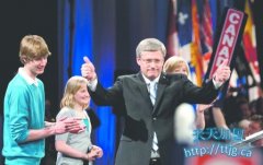 总理哈珀周一首次赢得多数政府後,与家人感谢卡加利的支持者,向他们挥手。 (加新社) 哈珀接受妻子劳莲的吻贺。(加新社) 联邦保守党领袖哈珀周一扬眉吐气,在大...