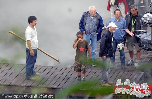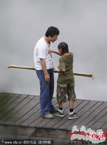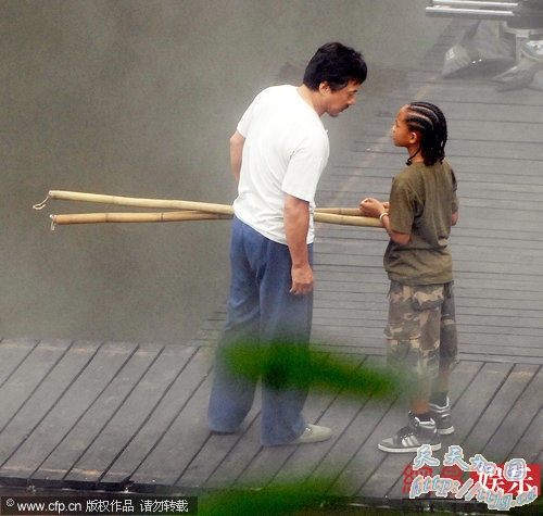 9月15日,主演成龙和威尔·史密斯之子贾登·史密斯(Jaden Smith)亮相河面打起的木桥上,准备拍摄当天的戏份。开拍前成龙大哥秀功夫绝活,传授贾登动作要领“陪练”,两人拿着两根竹竿比试身手,成龙惨遭顽皮的贾登出拳袭胸和用屁股撞身。