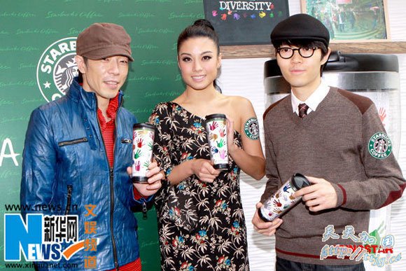 黄贯中(Paul)、廖碧儿(Bernice)及方大同,27日出席星巴克某分店开幕礼。