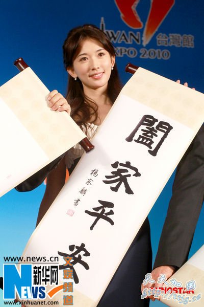 2010年上海世博会台湾馆代言人名模林志玲28日与亲善大使共同揭示象征台湾民众2010年新年愿望的 “合家平安”、“经济腾飞”等12句天灯祈福语,林志玲也公开她的新年新希望就是:愿所有的朋友平安健康。代言人林志玲特地从外地赶回台湾来参加这场 “2010年上海世博会台湾馆亲善大使暨天灯祈福语发表记者会”,率领亲善大使团公开亮相,并为他们加油打气。