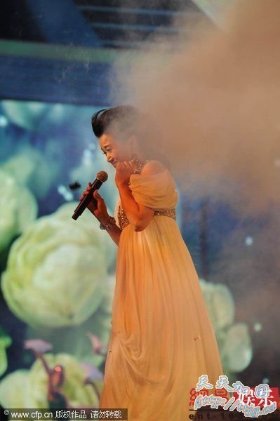 2010年5月21日,江苏淮安,某晚会5月20日晚在江苏淮安淮阴区录制。宋祖英身穿华美白裙纵情高歌,不料突然烟火响起,惊吓了宋祖英,她慌忙躲闪花容失色。