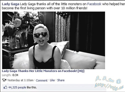 荣登在世人气女王,她向粉丝发twit说: “多谢那么多小魔怪在facebook追随我。我有1,000万个互相紧扣的朋友。”小魔怪little monsters,正是她给粉丝的昵称。