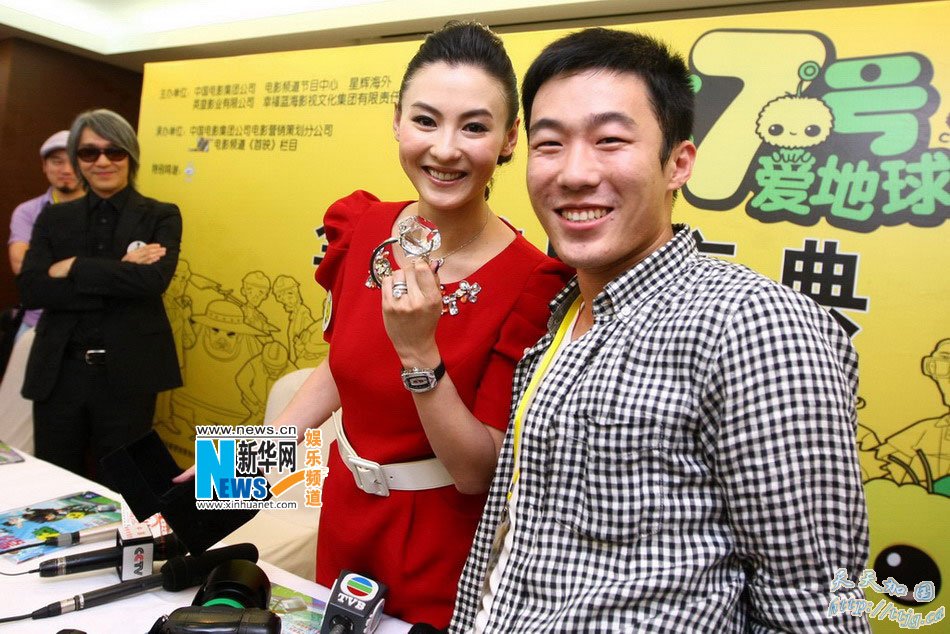 张柏芝亮相京城遇男版杨丽娟,遭娱记表白送戒指 昨天,周星驰监制的首部动画片《长江七号爱地球》在京举行首映发布会,周星驰携主题曲演唱者张柏芝、导演袁建滔、配音演员徐娇出席。张柏芝的出席令现场非常轰动,采访结束后,一名男记者激动地拦住张柏芝,并送上一枚巨型“钻戒”,令现场一片骚动。 周星驰为该片宣传一直亲力亲为,他说:“无论是否成功,我都想继续做动画片,为中国动画产业出一份力。我认为中国应该有自己的动画片,而且将来一定会达到世界水准,那会是我的骄傲。”星爷称,他希望今后做一些让小朋友开心的卡通片,传达一些正面观念。 对于动画版《长江七号》的票房期待,星爷没有预计,“这只是我第一部动画,票房当然重要,但我最希望多些家庭观众来看。”张柏芝和儿子Lucas一起为电影献唱主题曲,昨天张柏芝到场,她说:“这次和 Lucas合唱很开心,是金钱也买不到的珍贵时刻,我的手机也换了这首歌当铃声。”张柏芝透露,本来不懂普通话的Lucas现在已经能唱几句标准的普通话歌词了。至于Lucas的酬金,张柏芝说钱不重要,最重要是能拍出好的动画片。 大家追问Lucas的片酬是否已经高过父母,张柏芝笑着说:“作为他父母,当然希望了,不过他还太小,估计有难度。”当天群访结束后,一位男记者手捧着一个盒子冲向张柏芝。他激动地打开盒子,里面是一枚巨型“钻戒”。这名男记者把这枚“钻戒”送给了张柏芝,他自称是超级粉丝,说当记者就是为了张柏芝,“你曾经送过一个同样的礼物给小S,你似乎很喜欢,所以我特意找了个一样的送给你。我很喜欢你,我当记者就是为了你。”这位记者的表白令全场哗然。