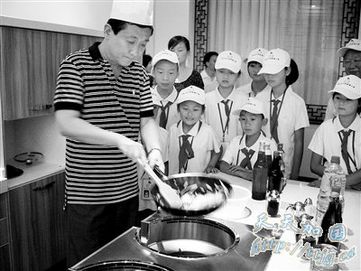为了款待这些孩子们,梁天决定亲自下厨炒菜。 戴上厨师帽,梁天显得挺专业,孩子们也哄地一下围上来,想看看梁校长是怎么炒菜的。