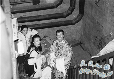 任雁(中间盖盖头者)与德国丈夫(右)在北京鼓楼举办婚礼,那英(左)一身休闲装扮当伴娘,和新郎官一起搀扶新娘上楼梯