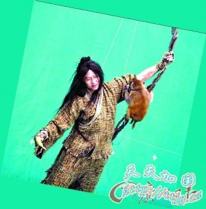 邓超:还没有看,只是配音的时候大致过了下。特技的桥段还是挺多的,为求逼真,几乎每场打戏都是要亲身上阵,有时候有被逼上“绝路”的感觉,印象比较深的是光明顶大战,张无忌要用绝招乾坤大挪移挑战峨嵋派掌门灭绝师太。为了表现乾坤大挪移的变幻莫测,剧组设计了一款能360度转动的小装置,在替身的配合下,我需要在旋转的状态中摆出腾移的造型,而对手演员则要默契地往相反方向张望。但由于装置处于旋转状态,我们还需要做出武打动作,相当不好拍,当时也因为转速不稳先后掉下了装置。