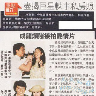 曾经出轨的成龙,自称犯了全天下男人都会犯的错。杜惠东这次在书中图文并茂地讲述成龙的风流史。上世纪70年代,成龙以艺名陈元龙拍过不少艳情片,讲到这段往事,杜惠东在书中用了一张成龙穿白色内裤,旁边坐着一个半裸上身以双手遮胸的女星的照片,令人浮想联翩。书中还透露成龙当年初出茅庐,性感女星米兰及丹娜都对他有意思,但他年少胆小不敢乱来,去了一趟澳大利亚回香港后才“开洋荤”,开始了解男欢女爱。据杜惠东描述,上世纪80年代初成龙凭电影《龙少爷》蹿红后,身边美女更是团团转,而且都是女追男,恬妞、吕琇菱、彭雪芬甚至“正印”林凤娇都曾先后“追龙”,而成龙在美国上进修班时邂逅邓丽君,两人曾有一段情,不过最后他却选择了林凤娇。