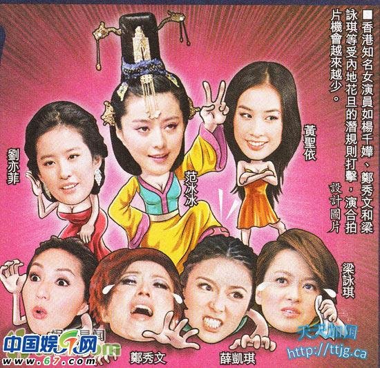 最近内地影坛潜规则情况越来越严重,不少内地花旦都有强劲电影公司或投资者作后台,以高片酬请香港红星如甄子丹、古天乐和刘德华等配衬他们力捧的花旦,形成香港女星纵使红如郑秀文和杨千嬅等,除了演出她们所属公司的电影外,几乎没太多机会演出中港合拍的大片,继续下去,香港女星迟早走向末路。