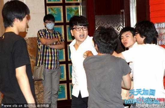 2011 年5月28日,北京,80后女歌手戊道子举办新专辑发布会。发布会上,戊道子与歌迷们亲切互动。谁知在发布会快结束时,一名男子闯入会场,并企图强行带走戊道子,在遭到戊道子的拒绝后,该男子动手打了戊道子一个耳光,并用“你以为你是谁”等词侮辱戊道子。该男子被保安推出场外后乘坐保时捷离开。图为打人男子在扇了戊道子一个巴掌后欲再动手,身边的其他人紧紧拉住他。