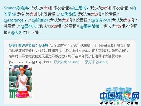 中国网球选手李娜晋升新任法网女单冠军,开创历史先河成为第一位摘得大满贯单打冠军的亚洲选手。网上流传一段冷笑话,将名字同叫李娜的歌手、跳水冠军和法网冠军逐一罗列,大S转发微博感叹称“神!女神!”,大S的这一言论被网友纷纷转发,广大网友异口同声:“我认为大S根本没看懂”,言下之意是指大S以为这几位李娜是同一个人。