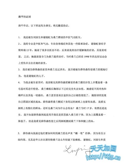 桑兰律师昨日公布的已被美国法院公证的证人路平证词复印件