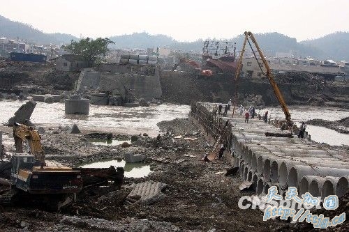 图为高雄县旗尾大桥(左)几乎全毁,工程人员近日正借助大型机械,加紧搭建一座便桥